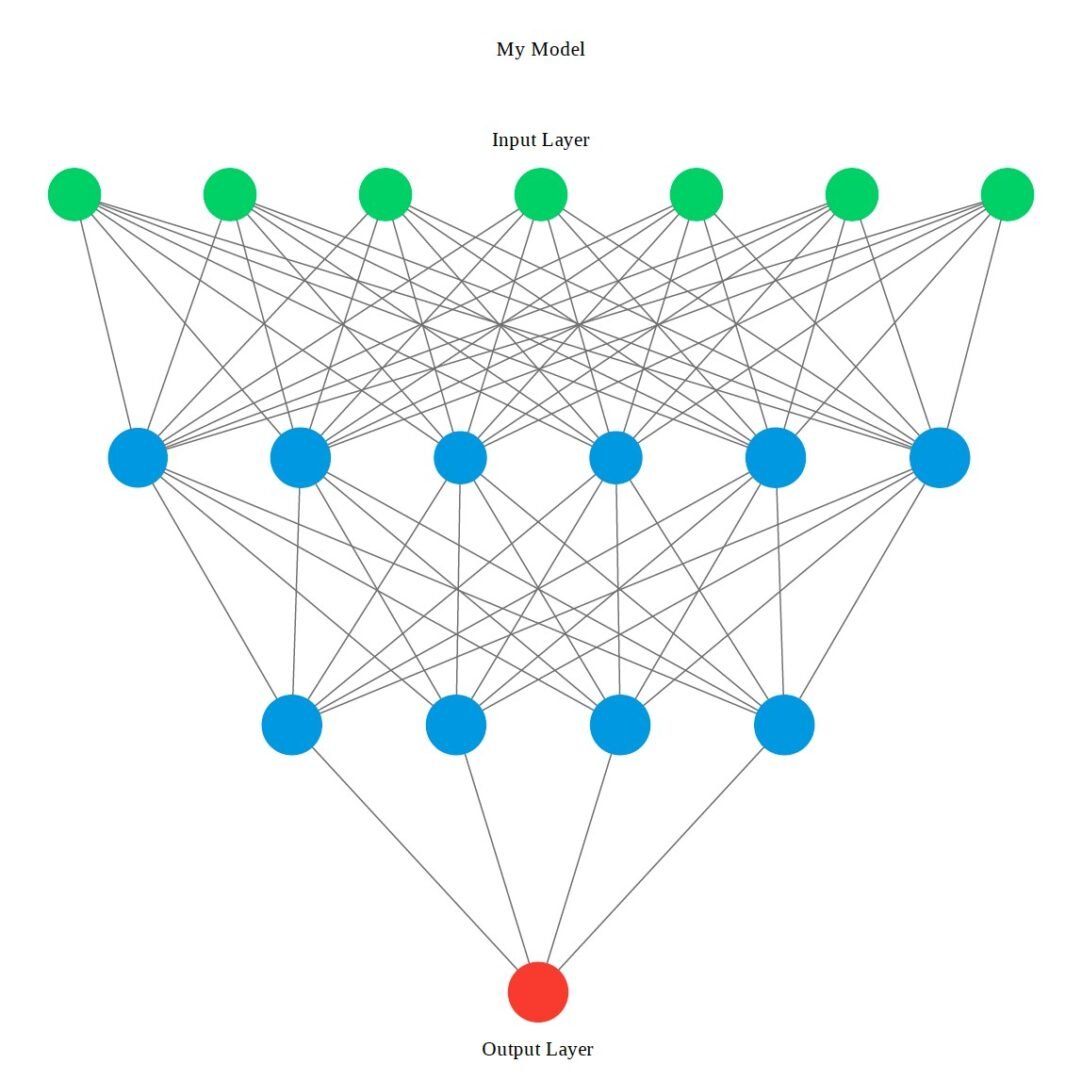 Un diagrama que muestra un modelo de red neuronal con una capa de entrada, dos capas ocultas y una capa de salida, que ilustra la estructura del aprendizaje profundo.