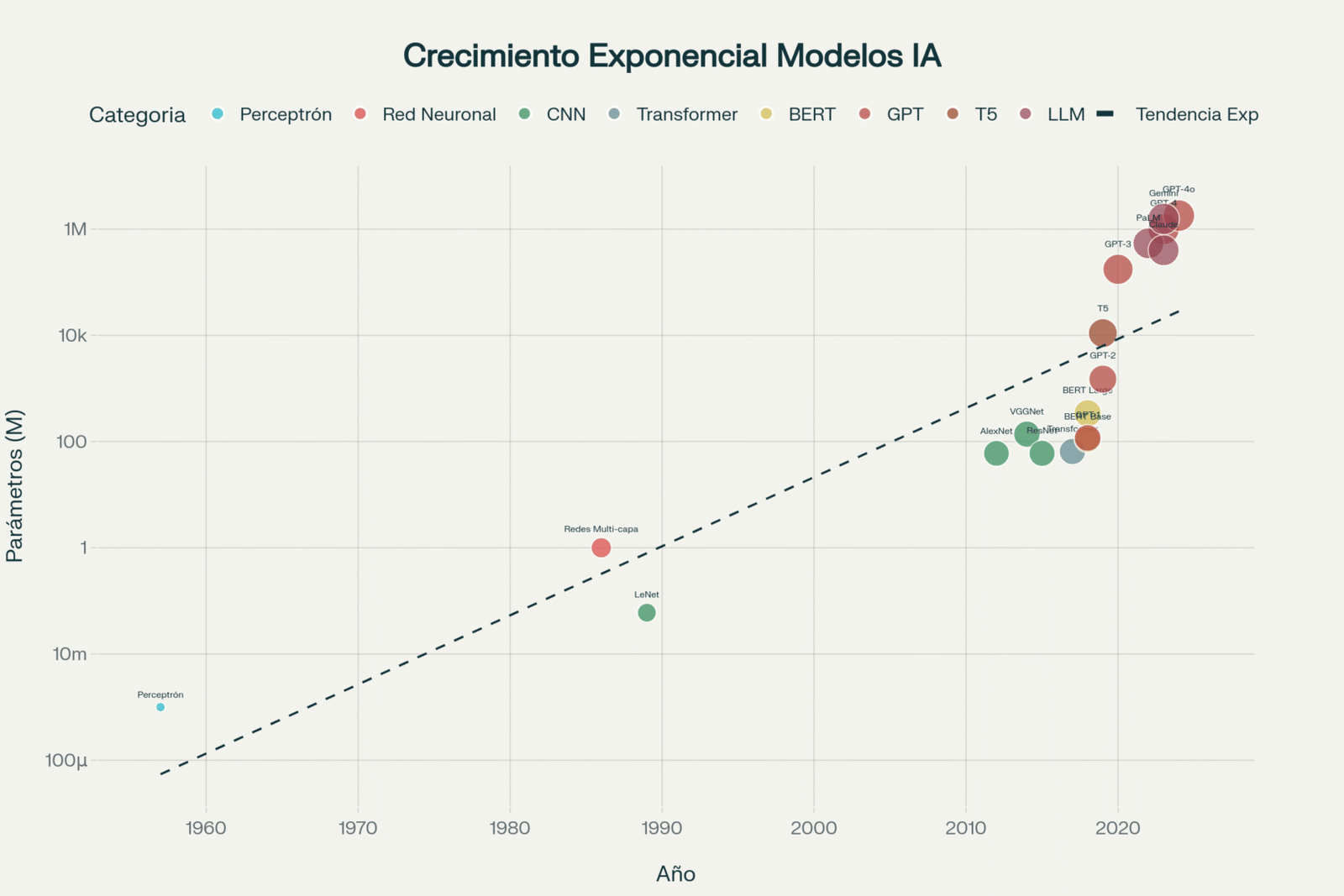Evolución exponencial del número de parámetros en modelos de IA, mostrando el dramático crecimiento desde el perceptrón hasta los LLMs modernos