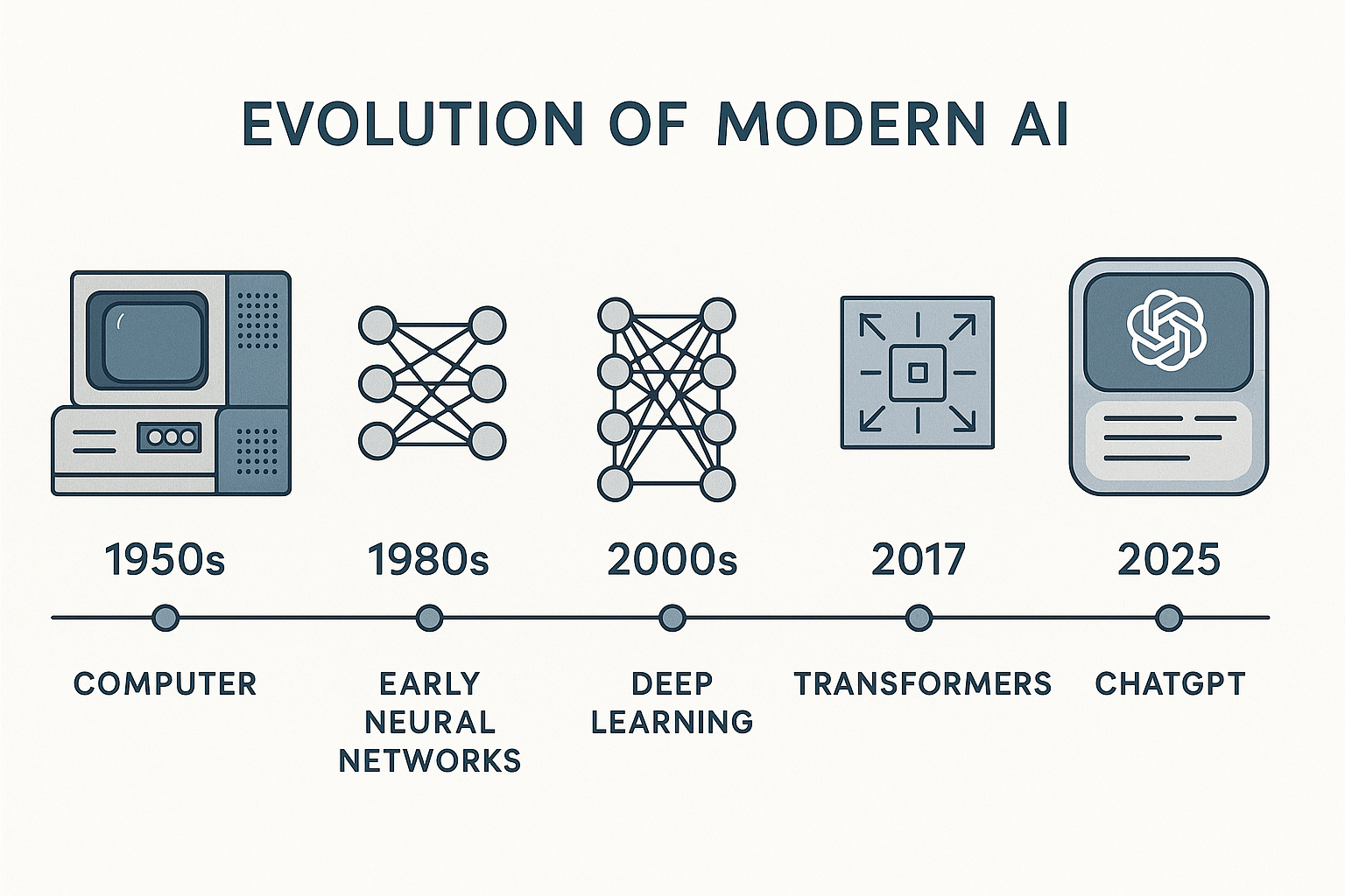 Evolución conceptual de la IA desde computadoras clásicas hasta sistemas conversacionales modernos