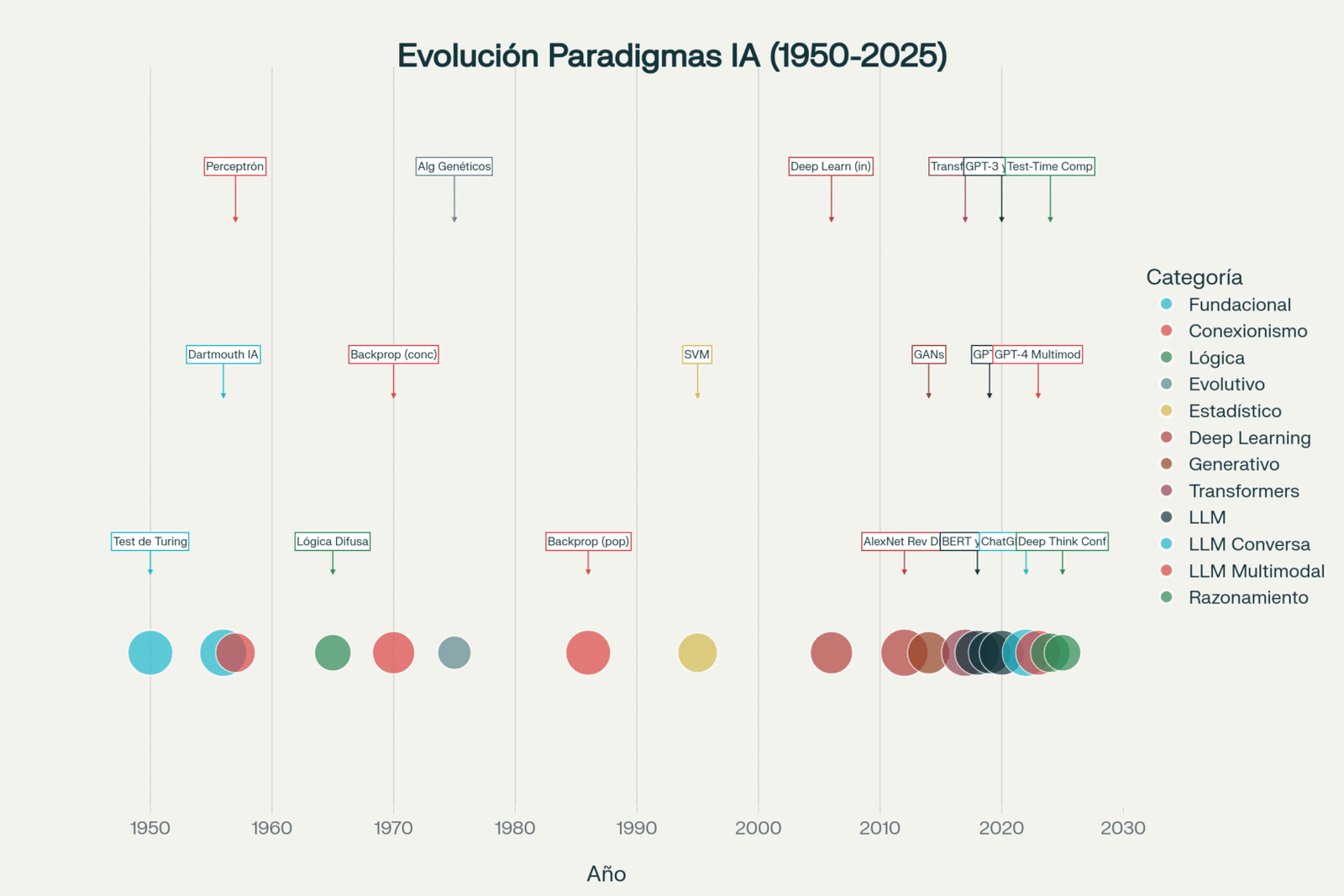 Línea temporal de los principales paradigmas de IA mostrando su evolución desde los fundamentos teóricos hasta los sistemas de razonamiento actuales